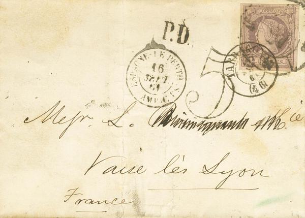 |ENVELOPE| 56. 1861. 2 reales lilac. TARRAGONA to VAISE LES LYON (FRANCE). Postmark R.CARRETA Nº46. MAGNIFICENT AND VERY RARE USE OF A 2 REALES STAMP TO FRANCE WITH EXCESS OF FIVE QUARTERS.
