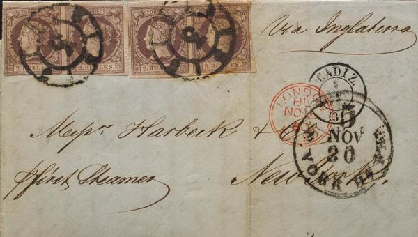 56(4). 1860. 2 lilac reales , two pairs. CADIZ to NEW YORK. Double bearing. MAGNIFICENT AND RARE.
