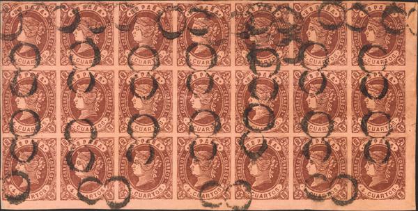 58. 1862. Spectacular and very complete attempt to reconstruct the complete set of the Rueda de Carreta postmarks, on the 4 brown cuartos and on letter, in the absence of Nos. 27, 54 and 59, some with double and triple bearings, No. 42 with double size, possibly the only one known. WITHOUT A DOUBT, A SPECTACULAR SET IN TERMS OF QUALITY AND EXTREME RARITY, FROM THIS POPULAR SECTION AND WHICH CAN VERY PROBABLY BE COMPLETED. IT IS ESSENTIAL TO EXAMINE.