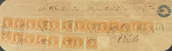 52(21), 56. 1861. 4 orange cuartos , twenty-one stamps (one stamp has come off) and 2 lilac reales (toned). Front of Certificate from CAZORLA to UBEDA. CAZORLA / JAEN postmark and on the front the (only known) CERTIFICATE / Nº mark, in blue belonging to Cazorla, in addition to the certificate number. MAGNIFICENT AND SPECTACULAR CERTIFIED POSTAGE IN THE ISABELINE PERIOD, THE ONLY KNOWN IN THE TOWN OF CAZORLA AND WITHOUT A DOUBT ONE OF THE LARGEST CERTIFIED POSTAGES OF THE ISSUE.