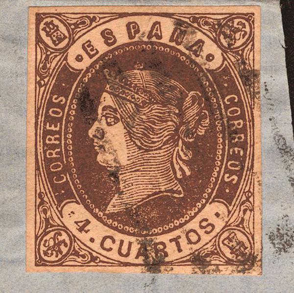 △ 58. 1862. 4 chestnut cuartos , on fragment. Postmark PEDRAZA / SEGOVIA. MAGNIFICENT.