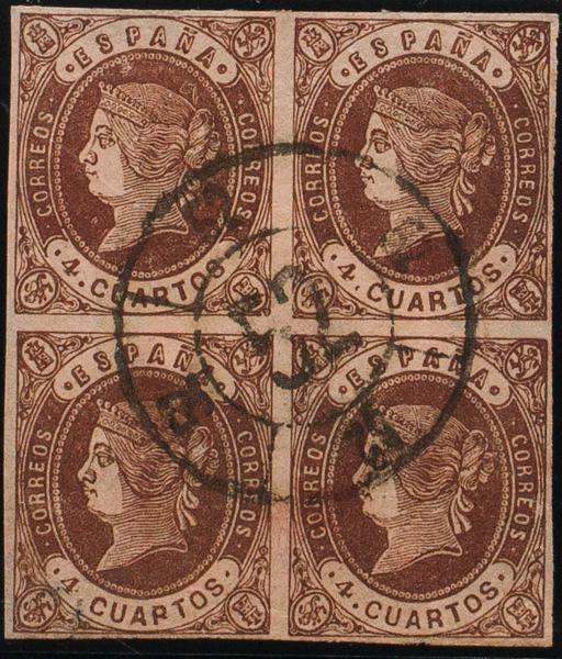 61(4). 1862. 1 real chestnut, block of four (negligible fold affecting two stamps). Postmark BRIVIESCA / BURGOS. MAGNIFICENT. Edifil 2014: 190 Euros