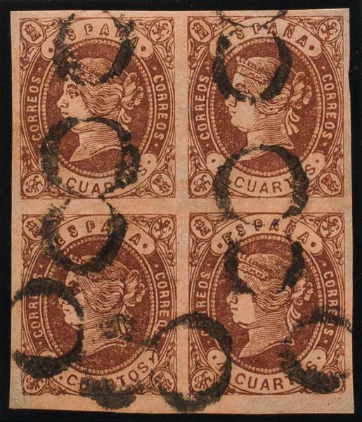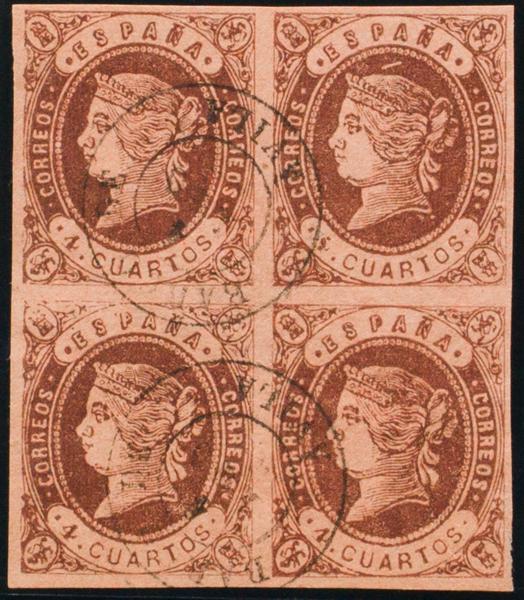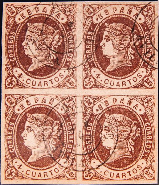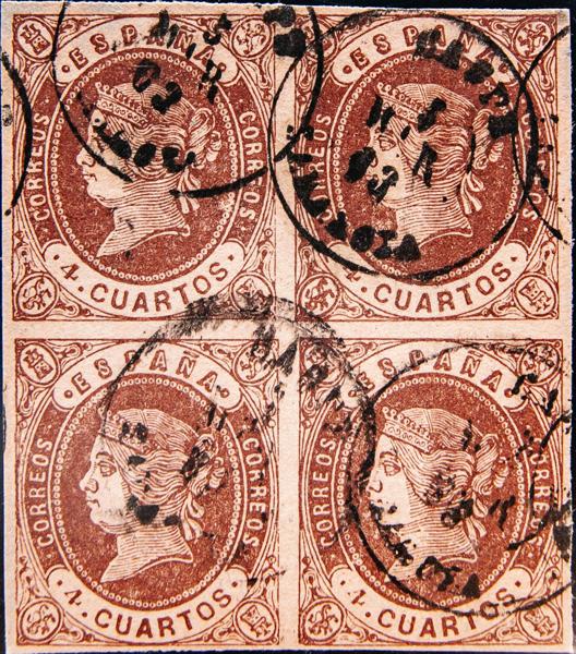 61(4). 1862. 1 real chestnut, block of four. Postmark OLMEDO / VALLADOLID. MAGNIFICENT AND RARE. Edifil 2014: 190 Euros