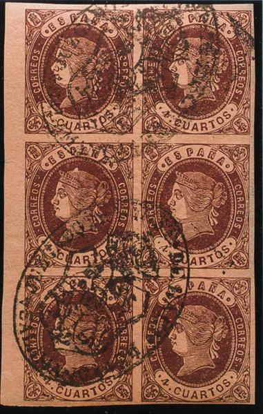 58(6). 1862. 4- cuartos chestnut, block of six, leaf edge. Postmark COURT OF 1ST YNSTA OF HCDA DE / SALAMANCA. MAGNIFICENT.