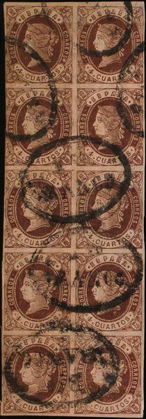 58(14). 1862. 4 chestnut cuartos , block of fourteen. Postmark BCO / FRANCO, Barco de Valdeorras. MAGNIFICENT AND EXTREMELY RARE BLOCK OF FOURTEEN, WITHOUT DOUBT THE LARGEST KNOWN BLOCK.