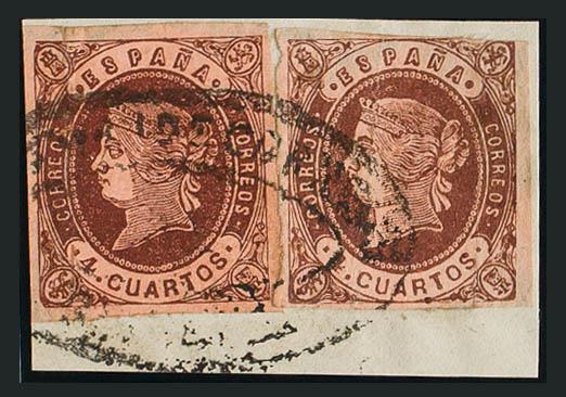 △ 58(2). 1862. 4 cuartos chestnut, pair on fragment. PAMPLONA pre-philatelic postmark. MAGNIFICENT AND VERY RARE IN THIS EXCEPTIONAL QUALITY.