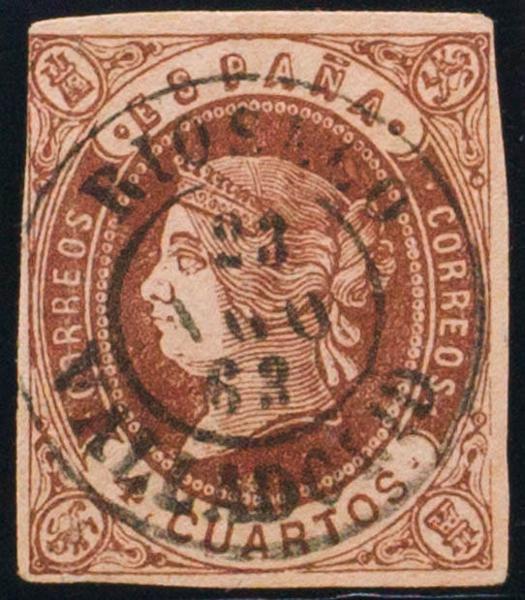 58. 1862. 4- cuartos chestnut. Postmark RIOSECO / VALLADOLID. MAGNIFICENT.