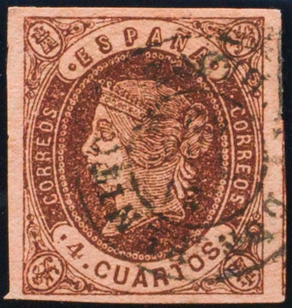 58. 1862. 4- cuartos chestnut. Postmark ALMENDRALEJO / BADAJOZ. MAGNIFICENT.
