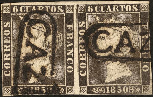 6(2). 1851. 6 cuartos black, pair. Registration of Shipment of the Lute Virgen del Mar from ALICANTE to ROSAS (GERONA). Postmark ARAÑA and on the front baeza *** / ALICANTE and handwritten annotation "I certify that this needs two 6- cuartos stamps" and delivery. MAGNIFICENT AND VERY RARE IN THIS ISSUE.