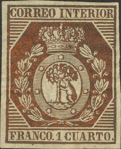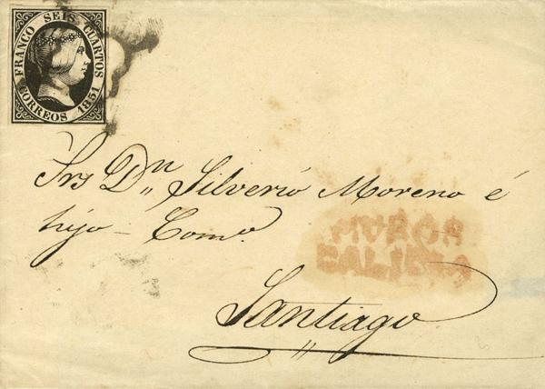 1. 1850. 6 cuartos black. Postmark "R", from Barcelona. Small fold, which does not deserve its pretty presence.