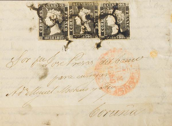 6(3). 1851. 6 black cuartos , three stamps. CORUÑA to MADRID. MAGNIFICENT AND VERY RARE WITH TRIPLE PORTION.