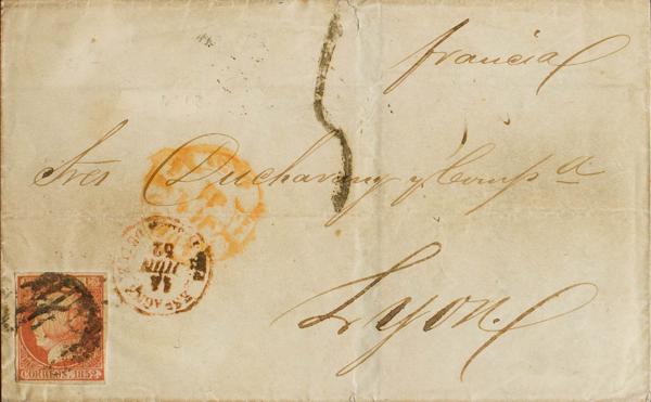 12. 1852. 6 cuartos pink. MADRID to LYON (FRANCE). Appraised in France with "5" tenths. MAGNIFICENT AND VERY RARE CIRCULATED WHEN THERE WAS NO POSTAL AGREEMENT WITH FRANCE.