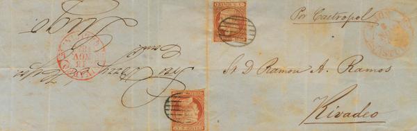 12(2). 1852. Dual-use letter from GIJON to RIVADEO and from RIVADEO to LUGO, franked with a 6- cuartos pink letter in each direction. MAGNIFICENT AND VERY RARE, TRULY SPECTACULAR.