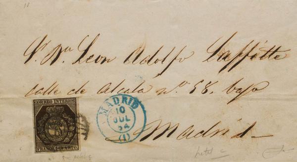 22. 1854. 1 bronze cuarto . MARSEILLE (FRANCE) to MADRID, deposited in the Madrid post office. MAGNIFICENT AND UNIQUE KNOWN WITH FOREIGN ORIGIN IN A CIRCULATED LETTER WITH STAMPS INTENDED ONLY FOR LOCAL USE. Certificate GRAUS.