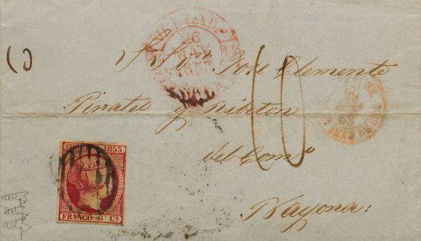 24. 1854. 6 carmine cuartos . SAN SEBASTIAN to BAYONNE (FRANCE). Postage paid to the border, there was still no postal agreement with France. MAGNIFICENT AND VERY RARE, ADDRESSED TO FRANCE, WHEN THERE WAS NO POSTAL AGREEMENT YET.