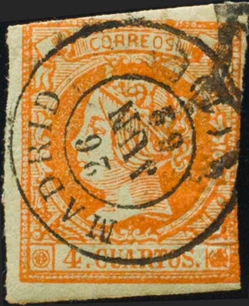 52. 1852. 4 orange cuartos (just right margin). Postmark MADRID / (1). MAGNIFICENT AND RARE.