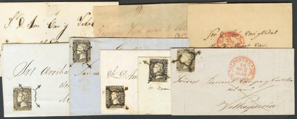 1. 1850. Beautiful set of eight cards and a front circulated with the black 6 cuartos , all of them originating from different towns (some of the Baeza prints are truly spectacular). TO EXAMINE.