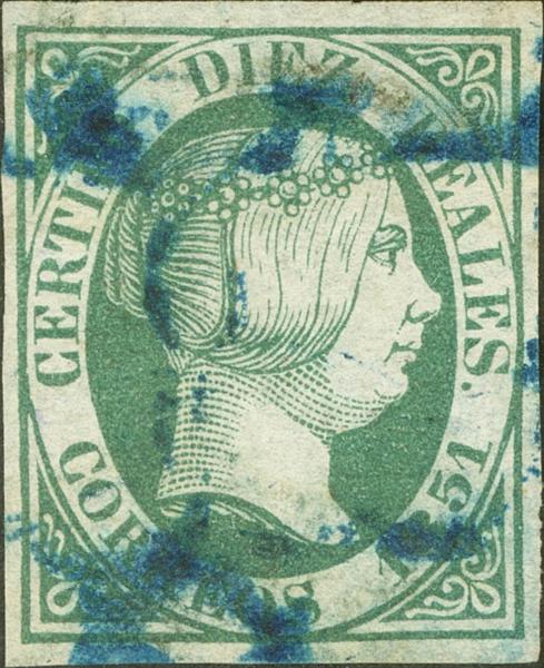 11. 1851. 10 green reales . SPIDER postmark, in blue. MAGNIFICENT AND VERY RARE, PIECE OF HUGE SPECTACULARITY. Cert. EMF. (Anecdotally, this piece fits perfectly with one of the two stamps with a blue spider that belong to the Jose Alberto Barreras collection). Edifil 2020: 1,775 Euros