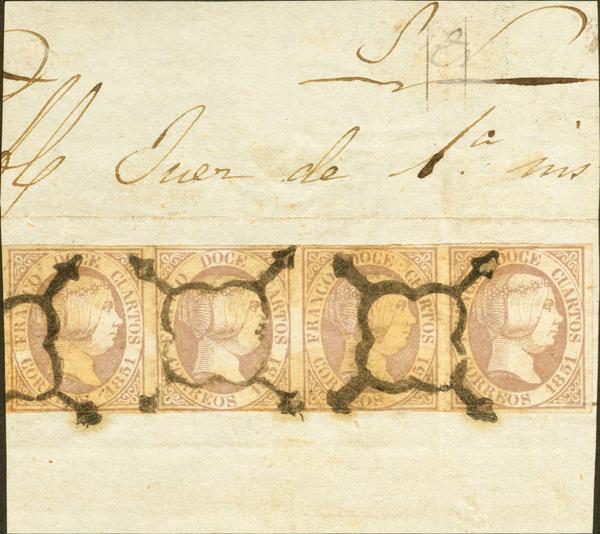 △ 7(4). 1851. 12 lilac cuartos, strip of four on fragment. ARAÑA postmark, in black. MAGNIFICENT AND VERY RARE.