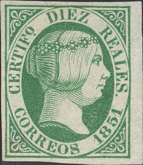 5. 1850. 10 green reales . Clean cancel and very intense color. PIECE OF LUXURY AND HUGE SPECTACULARITY. Cert. EMF.