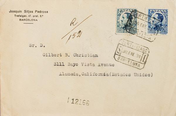 |ENVELOPE| 1085, 1053(2). 1951. 10 cts green and 50 cts grey, two stamps. Certificate from BAGoodELONA to CANILLO (ANDORRA). Arrival on the back. MAGNIFICENT.