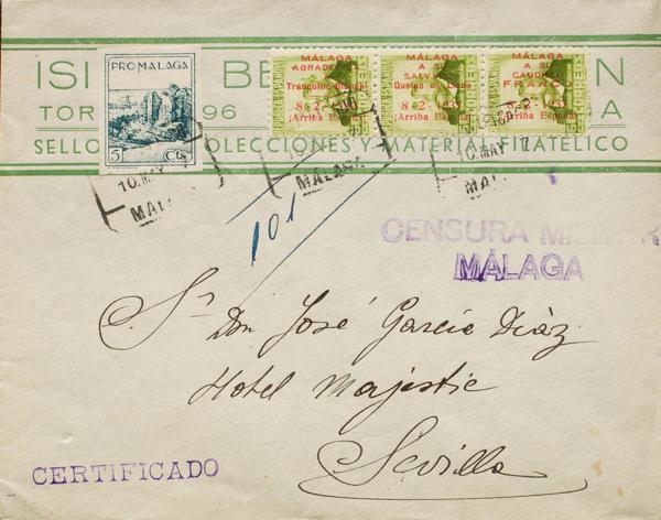 1936. 5 pink cts (Type V) Local of JUNTA PROVINCIAL DE RELIEF / MAHON (variety "SOCCRRCS") MAHON to BARCELONA. On the front mark of Franchise MILITARY COMMAND OF MAHON. MAGNIFICENT AND VERY RARE. (Phesophi 4d).