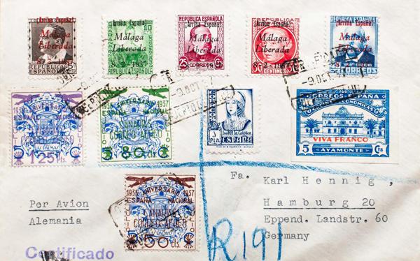 |ENVELOPE| 1/5. 1937. Complete series. PAMPLONA to LARACHE (MOROCCO). MAGNIFICENT.