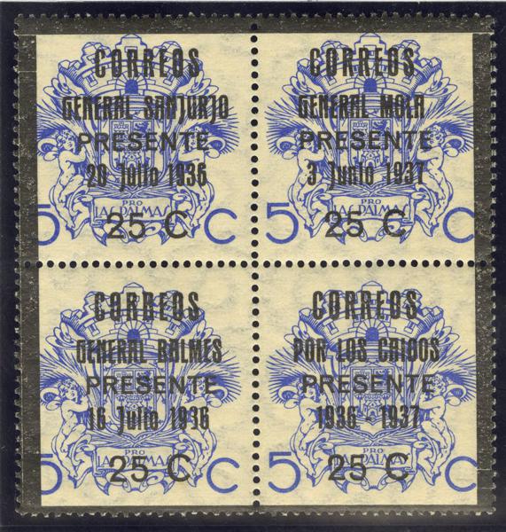 ★1937. Set of four block sheets of EPILA, 5 cts green + 5 cts chestnut, 5 cts blue + 5 cts pink and PRO AVION 5 cts blue + 5 cts pink with black and blue surcharges. MAGNIFICENT. (Fesofi 5, 5B, 11, 12 and Allepuz 22, 24, 27, 28)