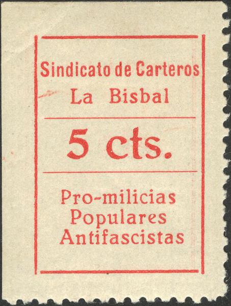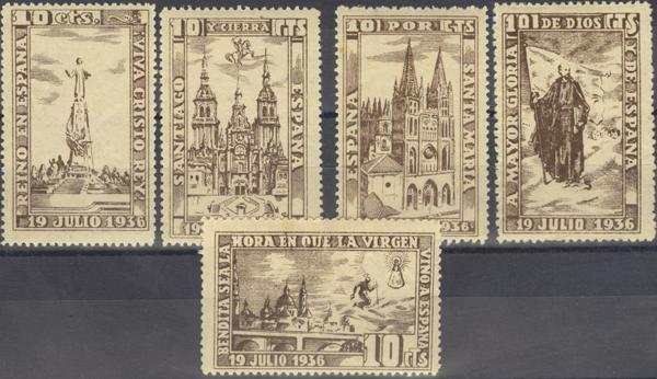 (★)/1937. Set of five local stamps from TARRASA (BARCELONA). MAGNIFICENT AND RARE. (Fesofi 1, 2, 3, 5, 10 and Allepuz 1, 3, 4, 5, 10)
