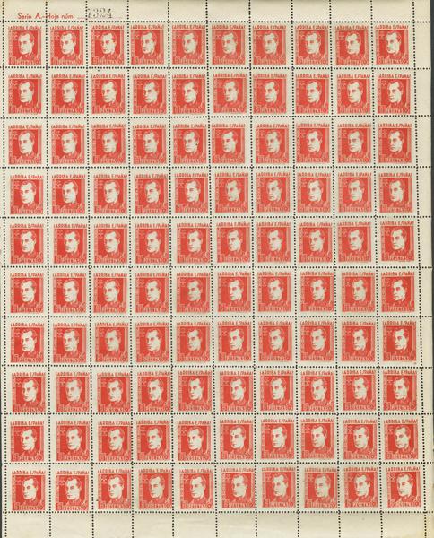 ★★1936. 6 red pts, complete sheet of one hundred stamps. MAGNIFICENT AND VERY RARE. (Allepuz 9)