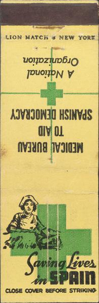 △(1936ca). Matchbox. MEDICAL BUREAU TO AID SPANISH DEMOCRACY, A NATIONAL ORGANIZATION, SAVING LIVES IN SPAIN, printed in New York to raise funds for American hospitals in Spain during the Civil War. MAGNIFICENT AND VERY RARE.