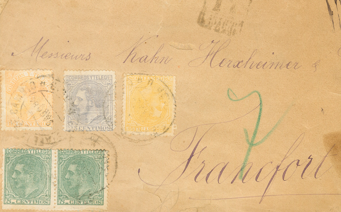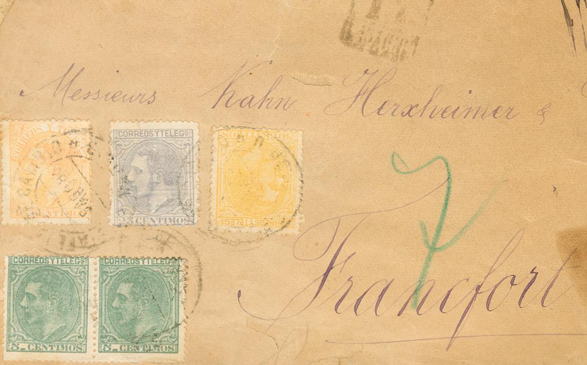 |ENVELOPE| 201(2), 204, 206, 210. 1884. 5 cts green, two stamps, 25 cts blue-gray, 50 cts yellow and 15 cts yellow. Front of Certificate from MADRID to FRANKFURT (GERMANY). Postmark ESTAFETA DE CAMBIO / MADRID. MAGNIFICENT AND SPECTACULAR TRIPLE CERTIFIED POSTAGE.