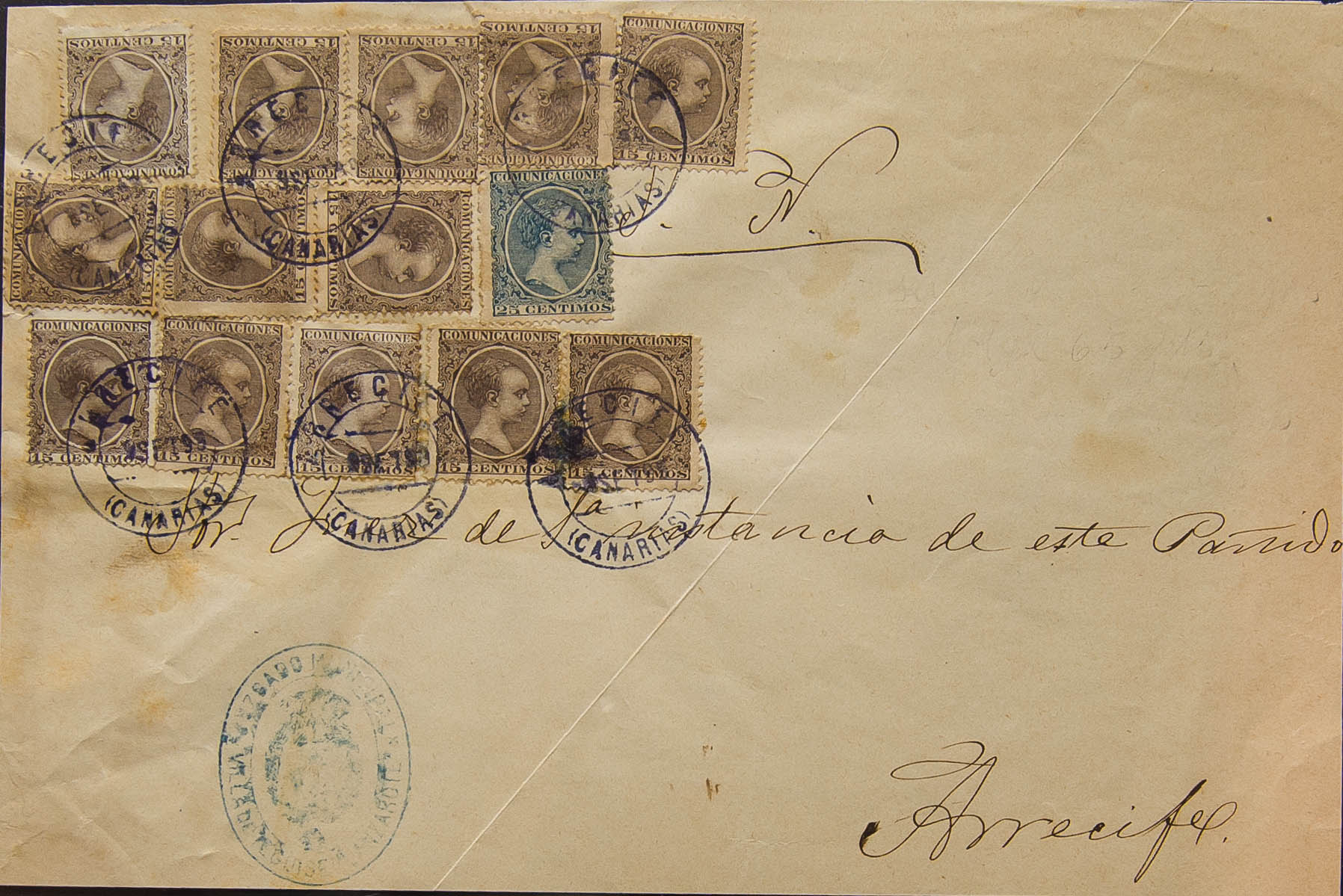 219(13), 221. 1899. 15 cts chestnut, thirteen stamps and 25 cts blue. Front of Judicial Escrow from TEGUISE to ARRECIFE. Postmark ARRECIFE / (CANARIAS) and on the front mark JUZGADO MUNICIPAL / VILLA DE TEGUISE-LANZAROTE, in blue. MAGNIFICENT AND RARE.