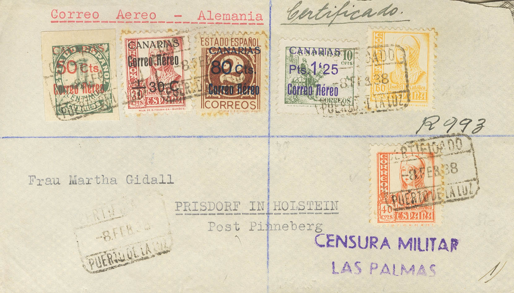 40/43. 1938. Complete series. Certified Air Letter from PUERTO DE LA LUZ (CANARY ISLANDS) to PRISDORF (GERMANY). On the back arrival. MAGNIFICENT.