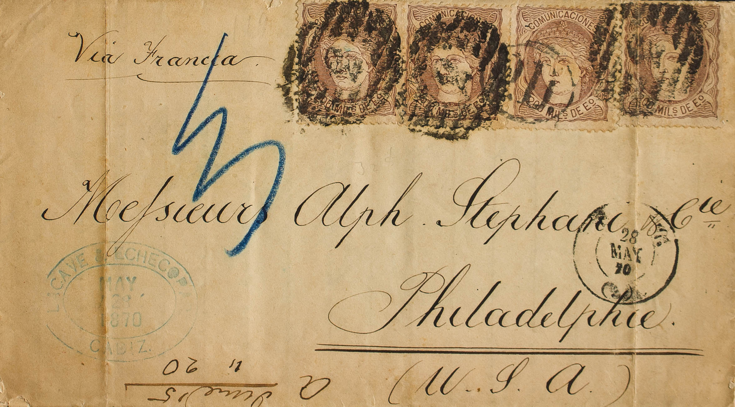 109(4). 1870. 200 chestnut mils, four stamps. CADIZ to PHILADELPHIA (USA). MAGNIFICENT AND RARE DOUBLE PORTION.