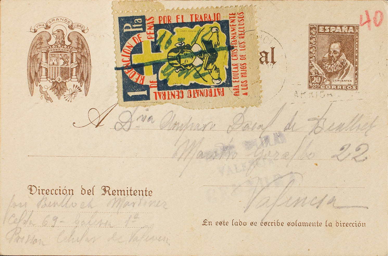 English EP86. 1942. 20 cts brown on Entire Postal Card Internal Mail of VALENCIA, franked with Benefic of 1 pts CENTRAL BOARD OF REDEMPTION OF PENALTIES FOR WORK. Written in the cell prison of Valencia. MAGNIFICENT AND RARE.
