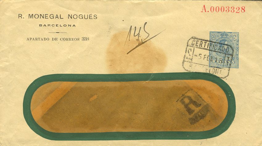 English 1913. 50 blue cts. Postal Stationery Certificate announcing R. MONEGAL NOGUES, arrival in Darmstadt on the back. MAGNIFICENT AND RARE.
