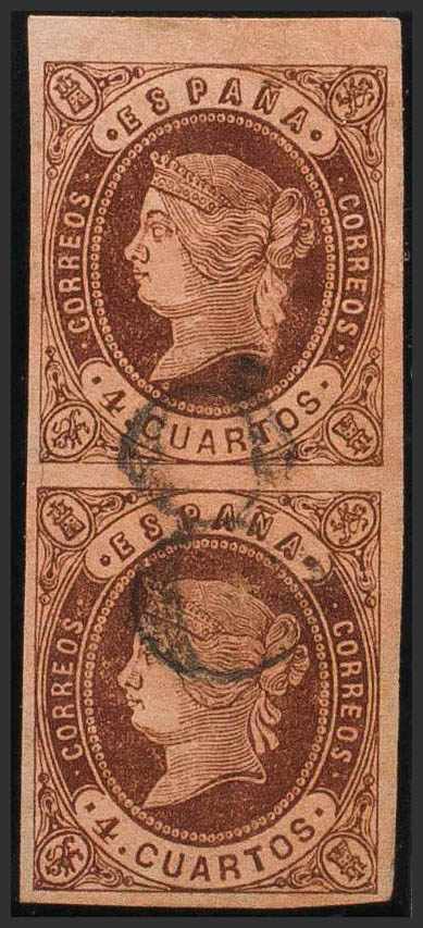 58(2). 1862. 4 cuartos chestnut, pair. Postmark "8", portage. MAGNIFICENT.