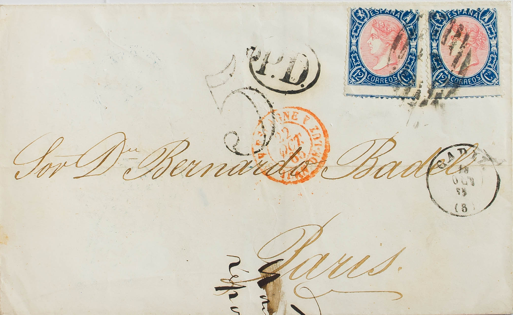 English 76(2). 1865. 12 blue and pink cuartos . CADIZ to PARIS. MAGNIFICENT AND SPECTACULAR POSTAGE OF DOUBLE POSTAGE.