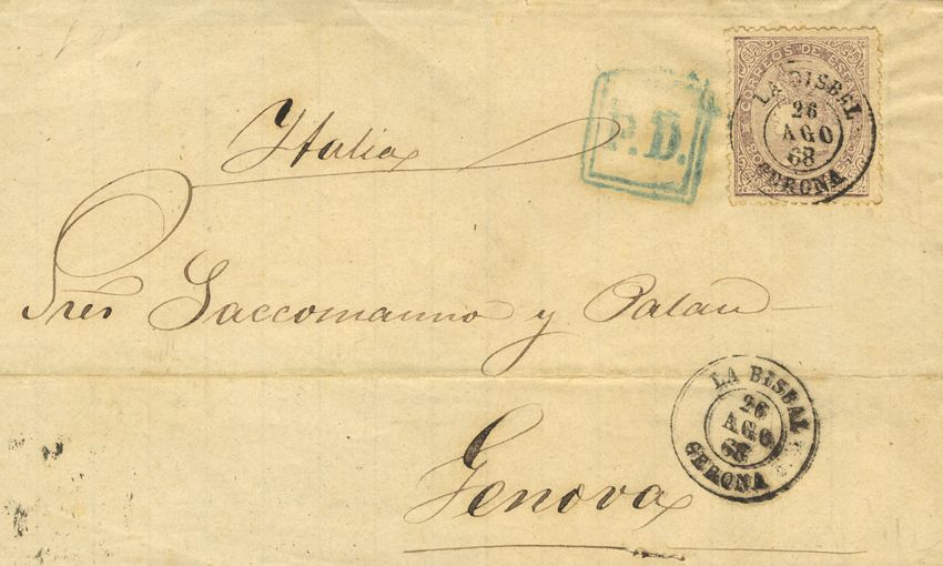 92. 1858. 20 cts lilac. LA BISBAL to ITALY. Postmark LA BISBAL / GERONA. MAGNIFICENT AND RARE.