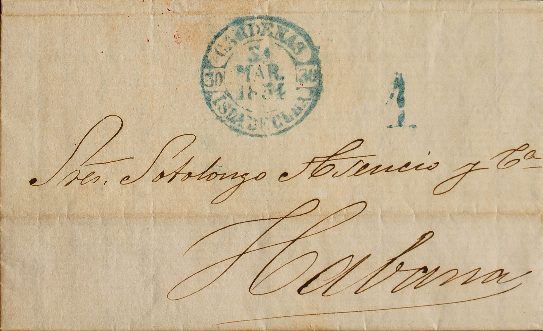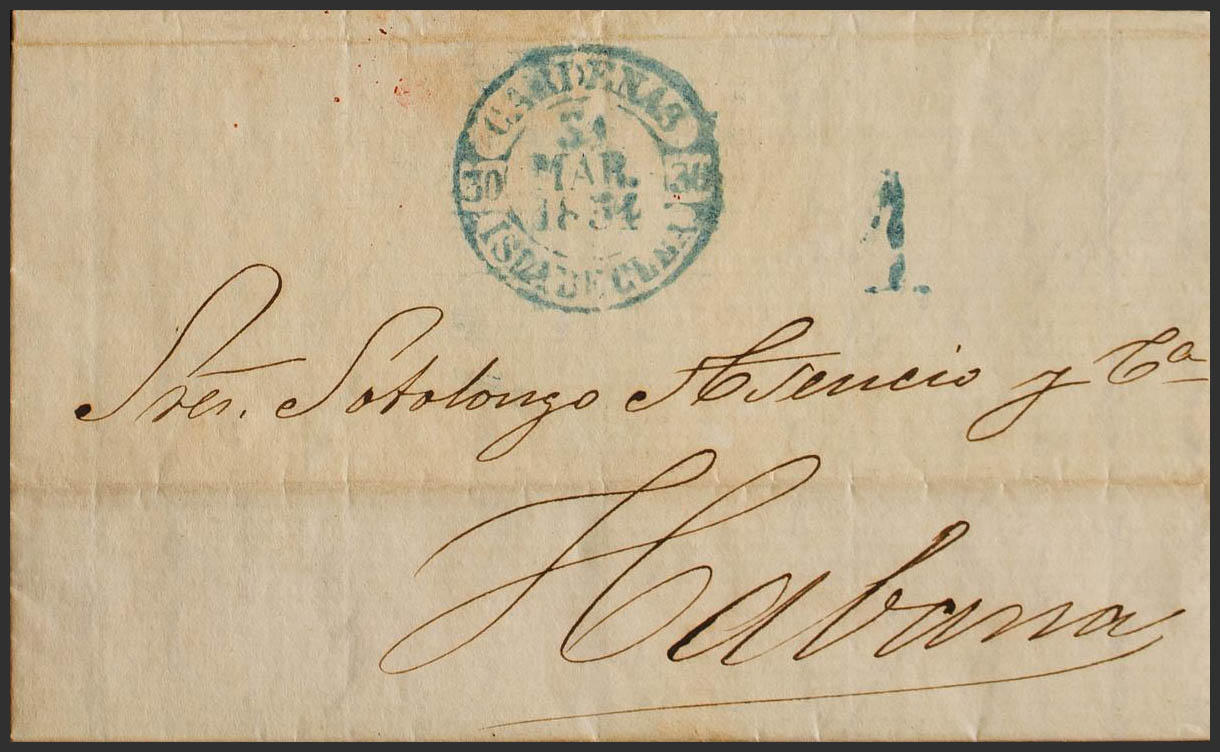 1854. CARDENAS to HAVANA. Baeza CARDENAS / ISLAND OF CUBA, in blue and portage "1" in the same color. MAGNIFICENT.