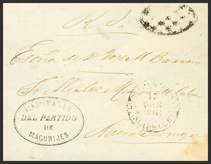 1861. MACURIJES to NEW BERMEJA. Brand GRILL COLONIAL, indicating that the letter circulated free of porte. MAGNIFICENT AND RARE.