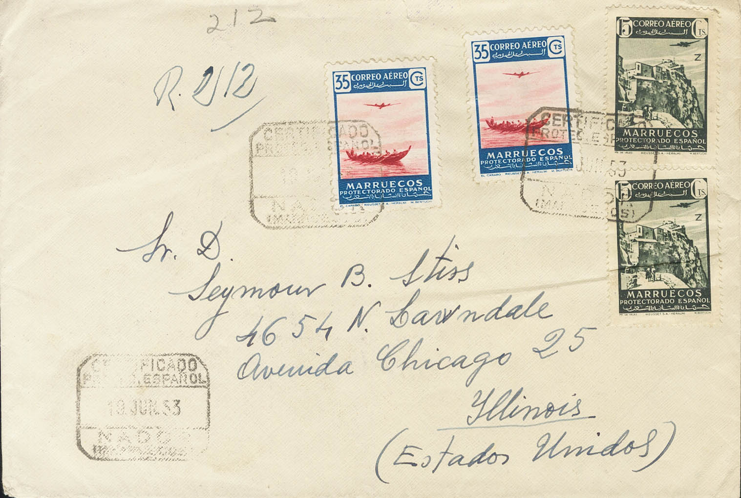 369(2), 243. 1953. 35 cts blue and carmine, two stamps and 15 cts blackish green, two stamps. NADOR certificate to CHICAGO (USA). On the back arrival. MAGNIFICENT.