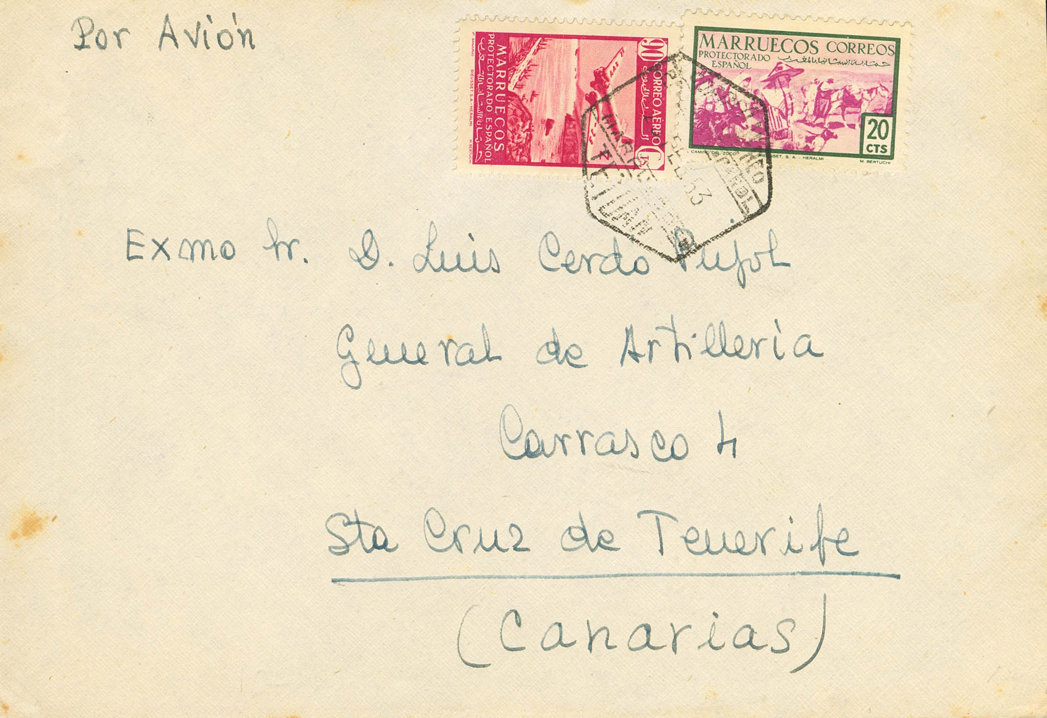 |ABOUT| 346, 244. 1953. 20 cts green and lilac and 90 cts lilac pink. TETUAN to SANTA CRUZ DE TENERIFE. MAGNIFICENT.