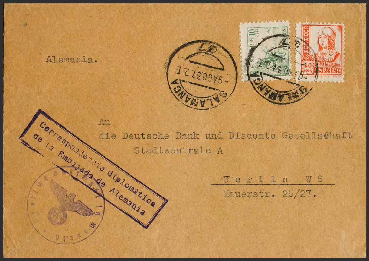 817, 824. 1937. 10 cts green and 40 cts orange. SALAMANCA to BERLIN (GERMANY). On the front it marks DIPLOMATIC CORRESPONDENCE / OF THE GERMAN EMBASSY and DEUTSCHE BOTSCHAFT IN MADRID, both in violet, at the end of 1936 the German Embassy moved to Salamanca, using the same stamp that it used in Madrid, on the back a clock-type date stamp arrival. MAGNIFICENT AND RARE.