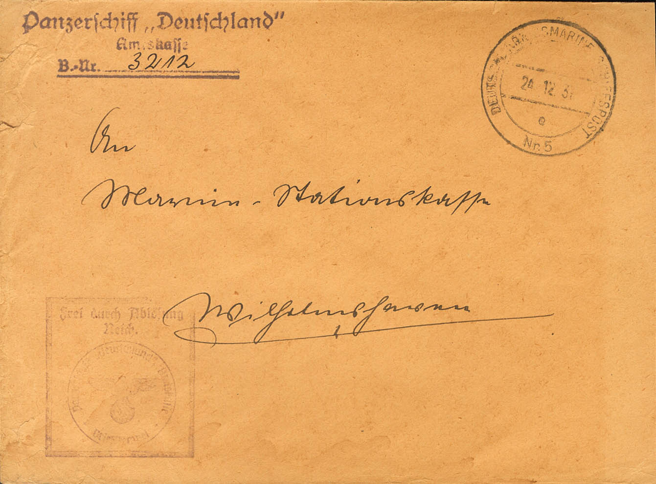 1937. Shipped from the pocket battleship Deutschland and addressed to WILHEMSHAVEN (GERMANY). PANZERSCHIFF mark "DEUTSCHLAND" and date stamp DEUTSCHE KRIEGSMARINE-SCHIFFPOST / NR5 (this ship, anchored in the port of Palma de Mallorca, was attacked by Republican planes in May 1937, causing thirty-seven deaths and seventy-four injuries). MAGNIFICENT AND RARE.