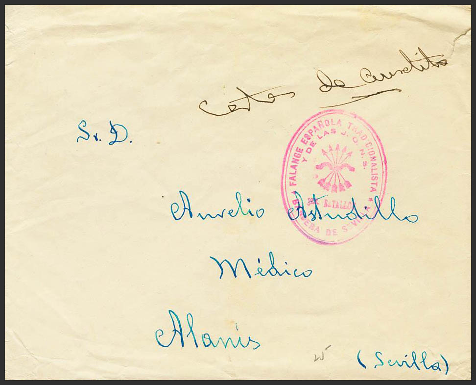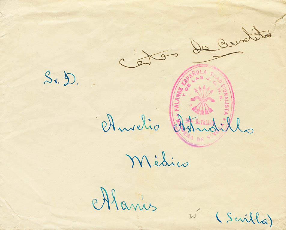 English 1939. MONTIJO to ALANIS. TRADITIONALIST SPANISH FALANGE mark / Y DE LAS JONS / 3rd BATTALION / FLAG OF SEVILLE. MAGNIFICENT.