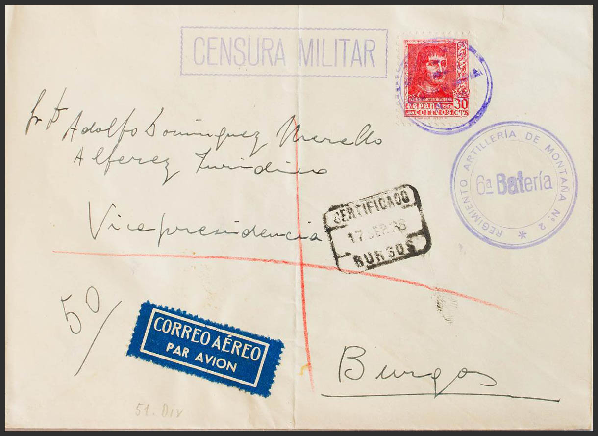 English 844. 1938. 30 cts red. BURGOS Internal Mail Certified Air Mail Letter. Postmark MOBILE BRIGADE / MAIL / CAMPAIGN POSTMARK / Nº10, arrival on the back. MAGNIFICENT.