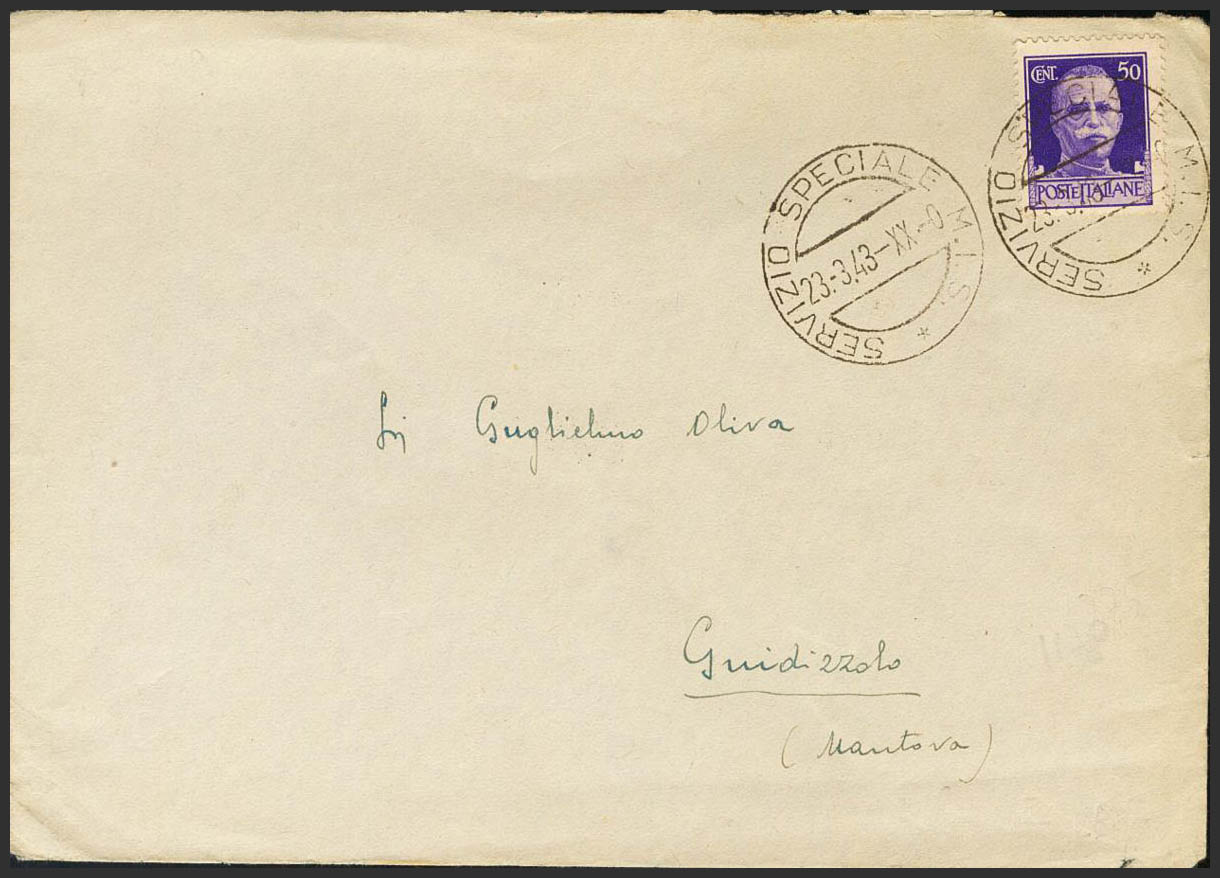 English 1943. 50 cts violet from Italy. Addressed to GUIDIZZOLO (ITALY) and sent from the MMIS (Missione Militare Italiana in Spagna). Postmark SERVIZIO SPEZIALE MIS and arrival on the back. MAGNIFICENT AND RARE.