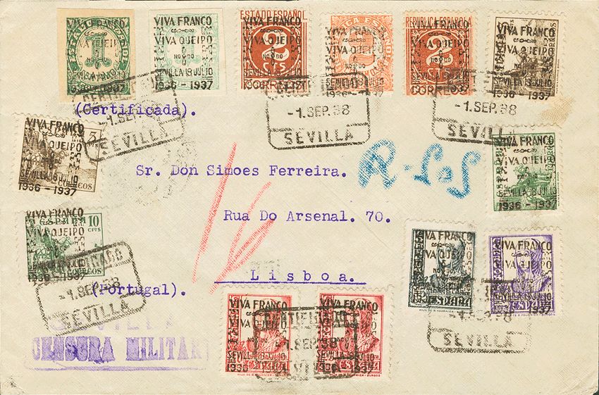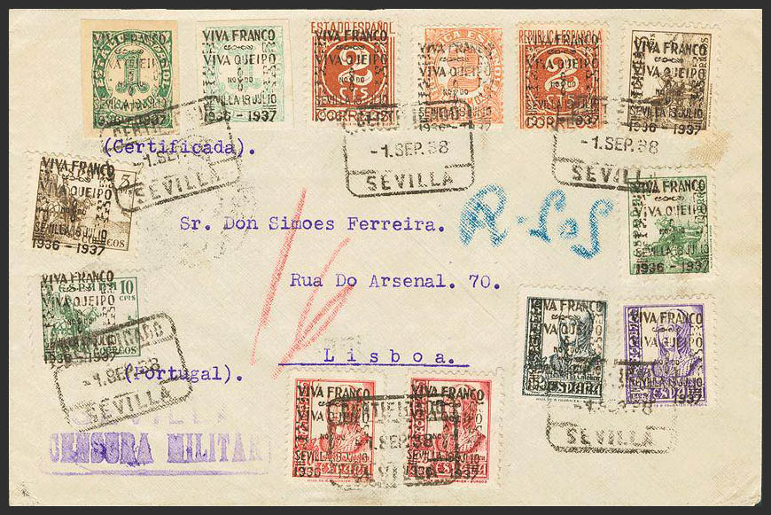 69/79, 74/75hx. 1938. Complete series and 5 cts and 10 cts, HORIZONTAL OVERLOAD FROM TOP TO BOTTOM. Certificate from SEVILLE to LISBON (PORTUGAL). On the back arrival. MAGNIFICENT.